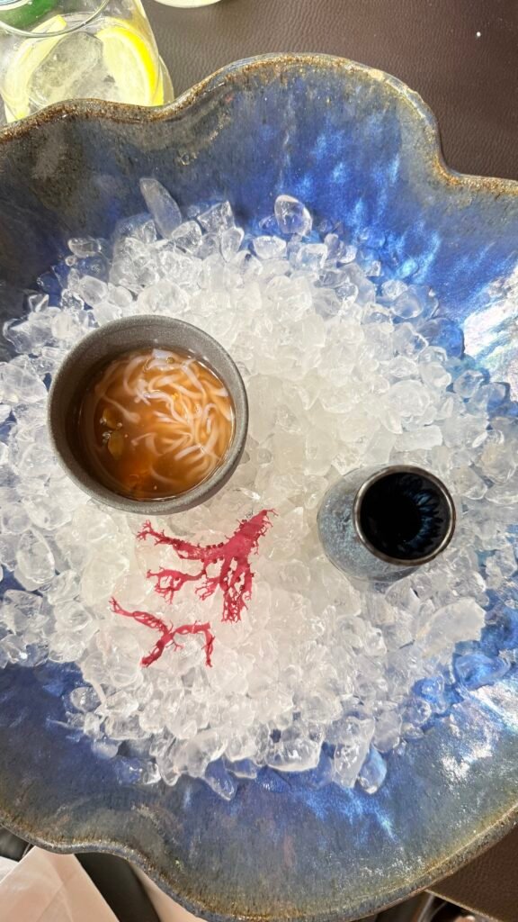 - Fideos Sōmen ahumados, caviar Osetra, erizo de mar y Mentsuyu de gazpacho 🤤