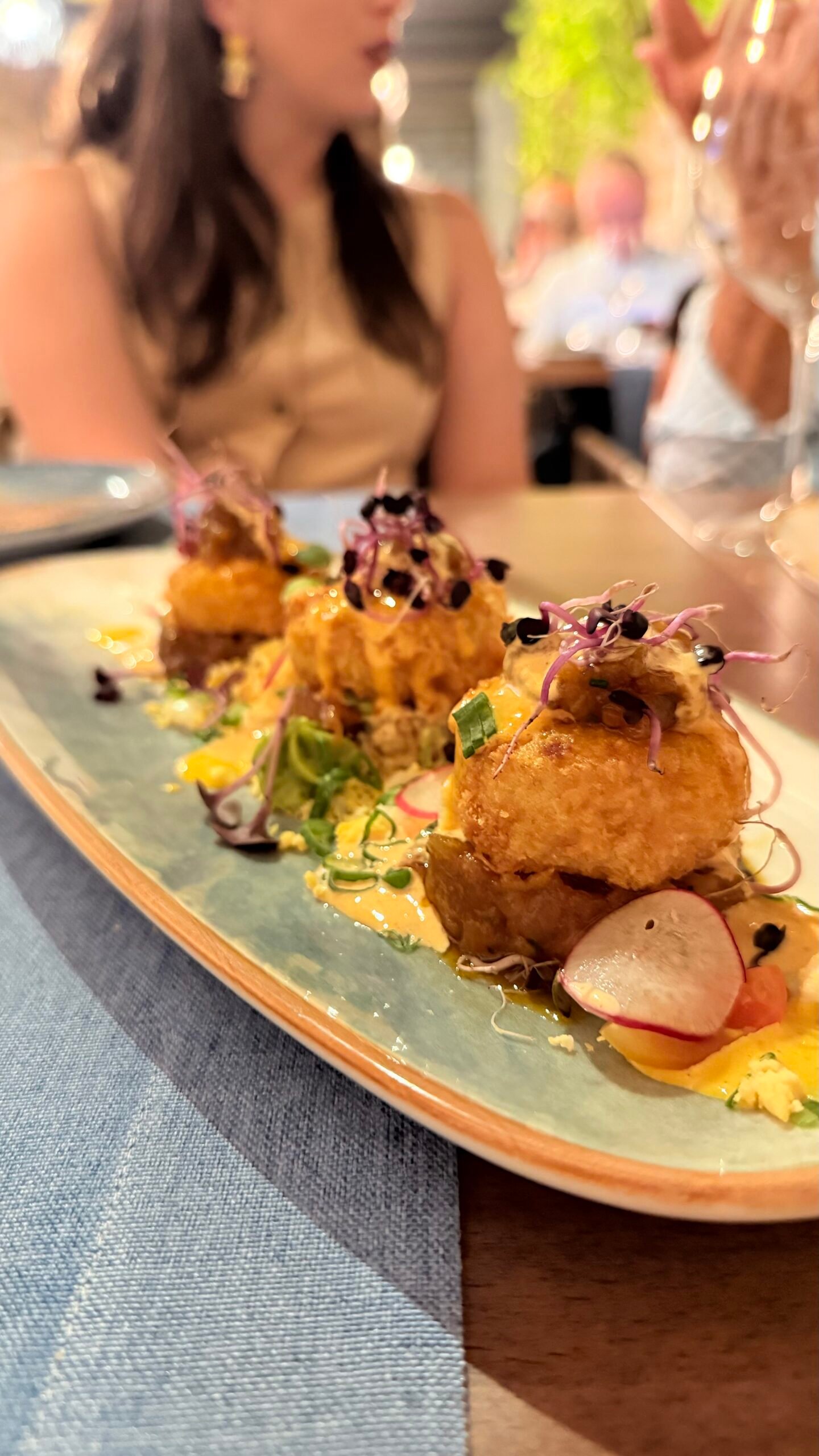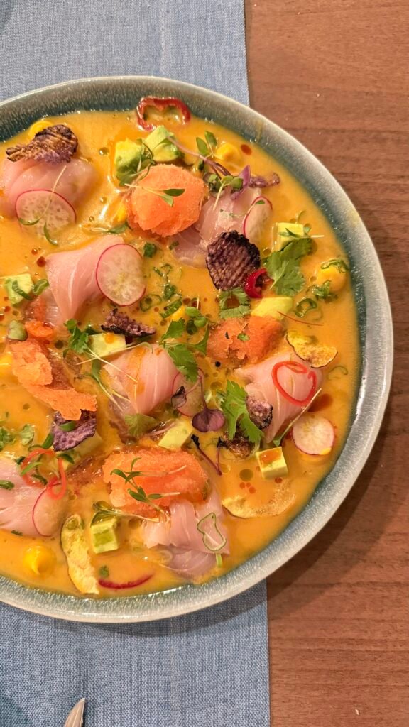 - Tiradito de pescado blanco de El Hierro, puntos de crema de ají rocoto, chips de tubérculos y granizado de naranja sanguina 🤤