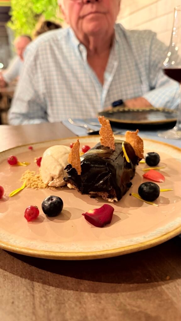 - Lingote de chocolate negro y parchita, salsa de frutos rojos, helado de avellana y teja de almendras